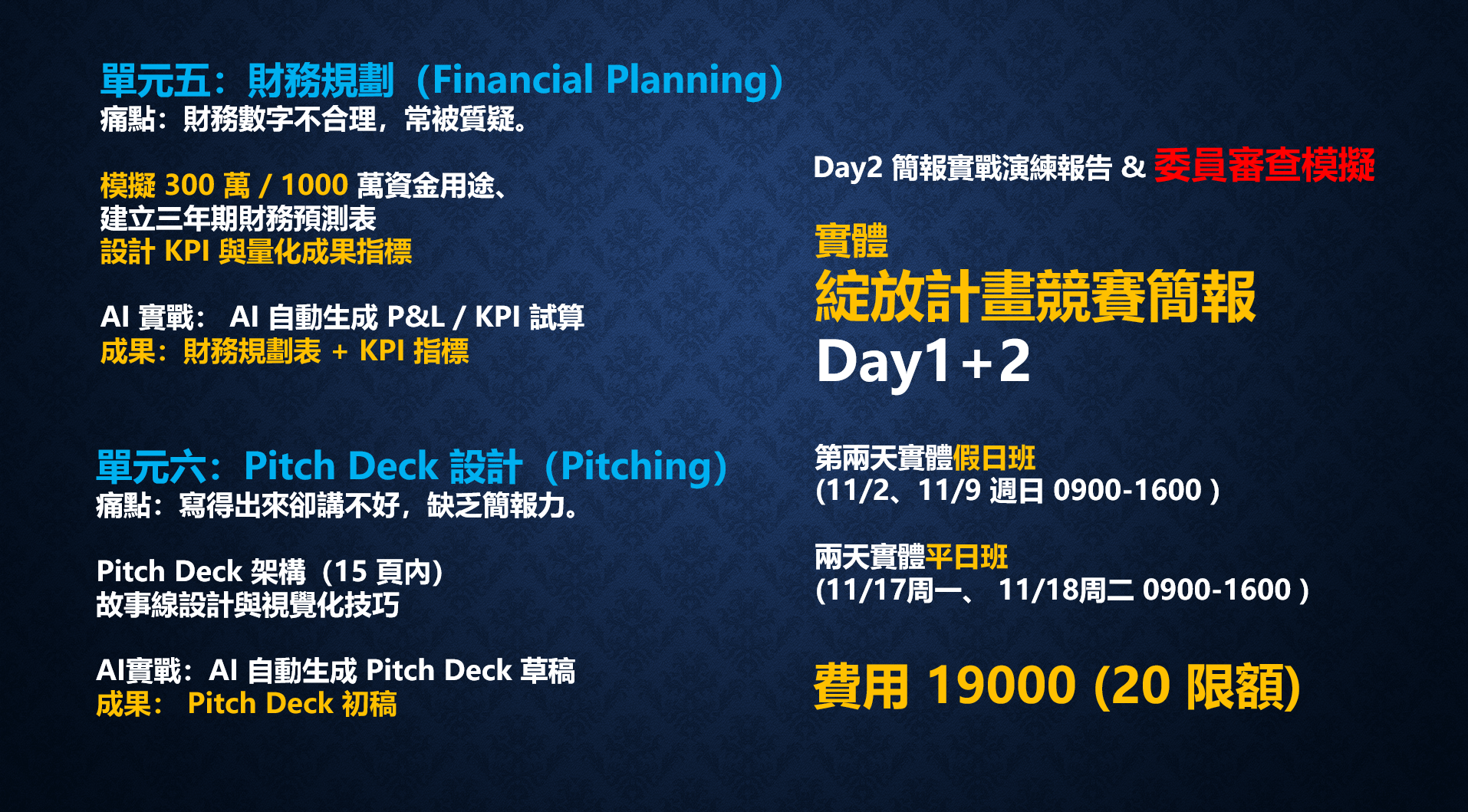 1. 計畫書 + Pitch Deck 雙產出: 學完就能帶走「初步計畫書」與「Pitch Deck 簡報」,可直接投件。